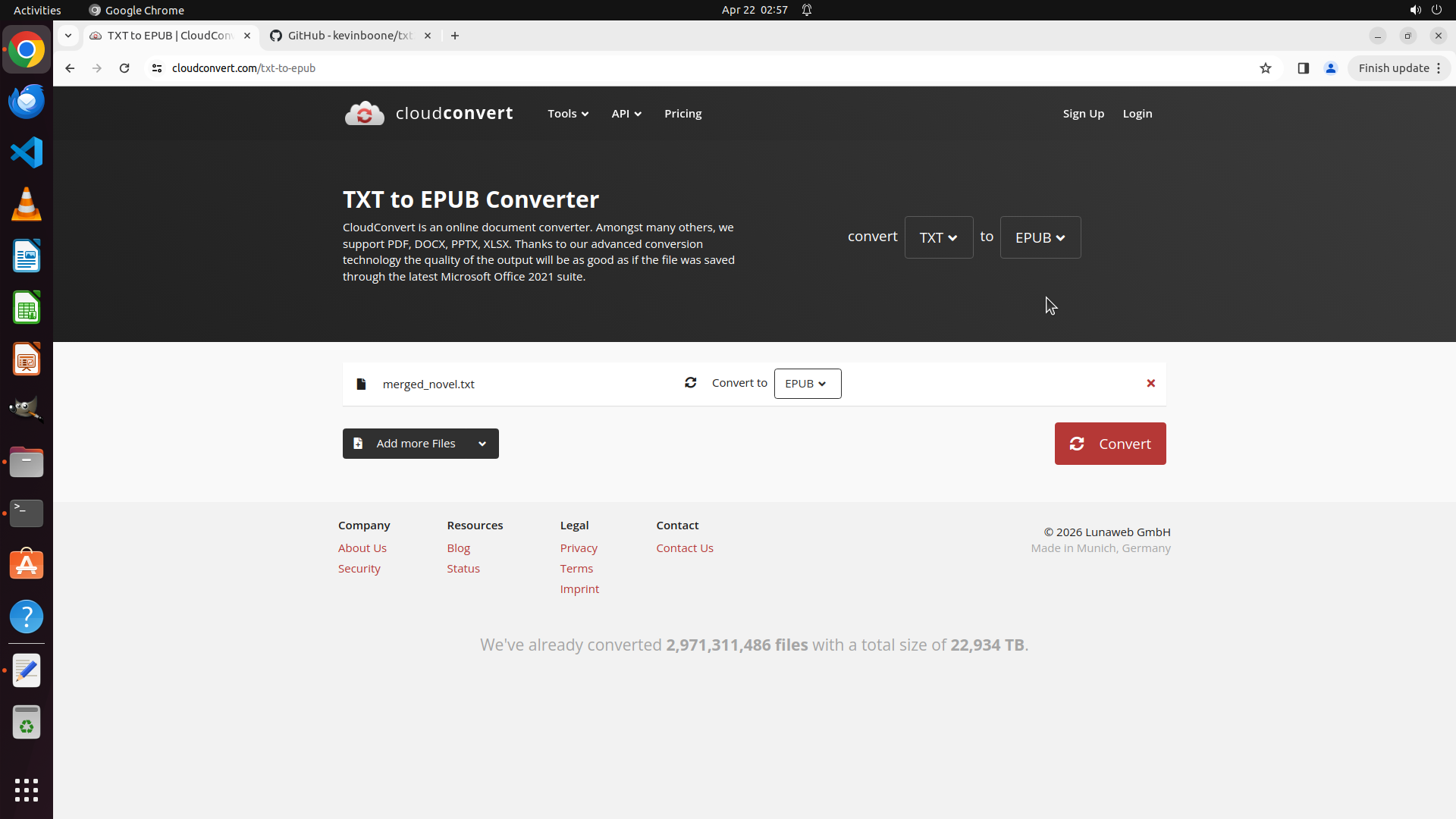 - 浏览器标签显示"TXT to EPUB | CloudConvert"