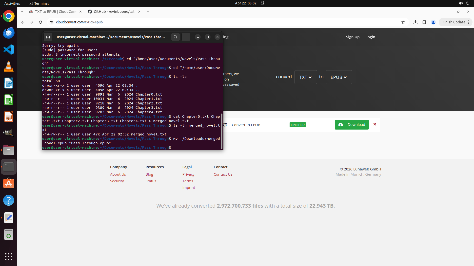 1. CloudConvert 已成功将 merged_novel.txt 转换为 EPUB 格式