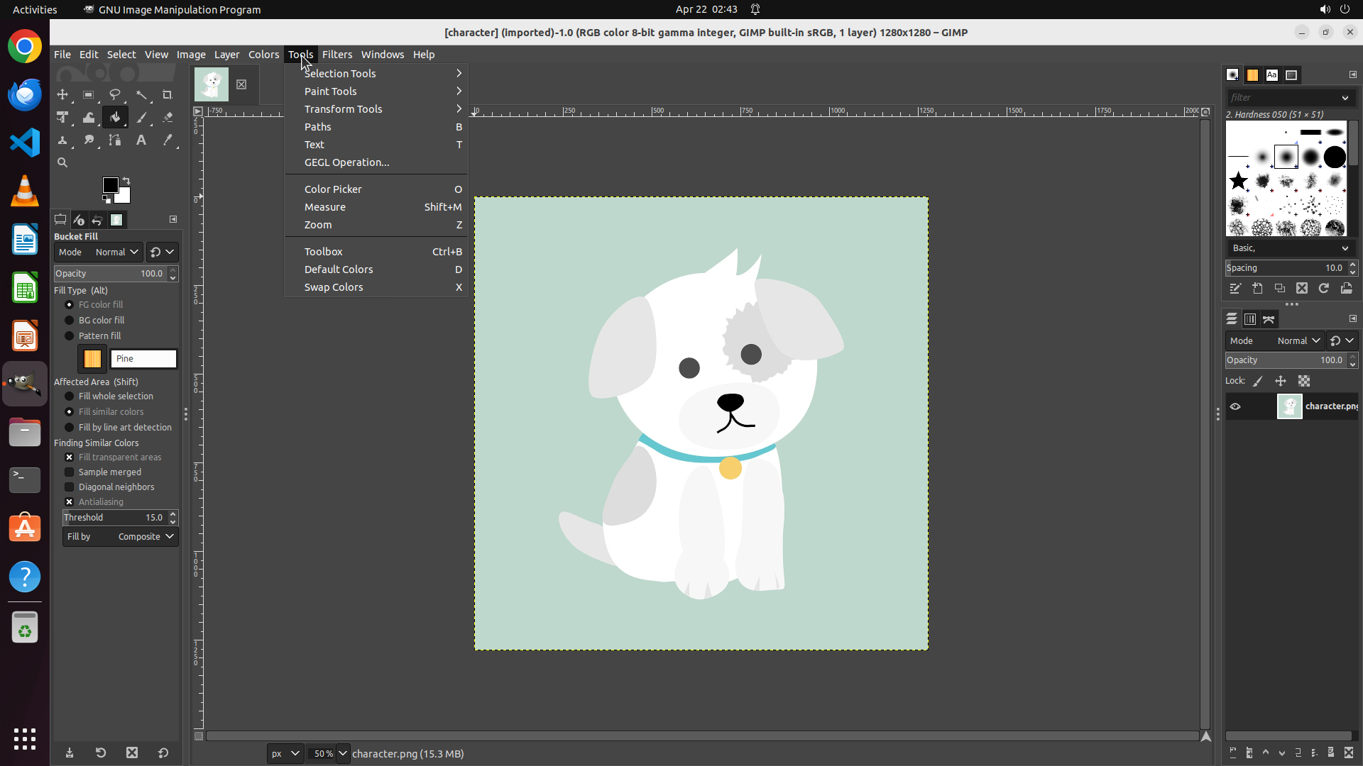 当前状态:GIMP已打开,character.png已加载,显示白色小狗在青色背景上。Tools菜单已打开。