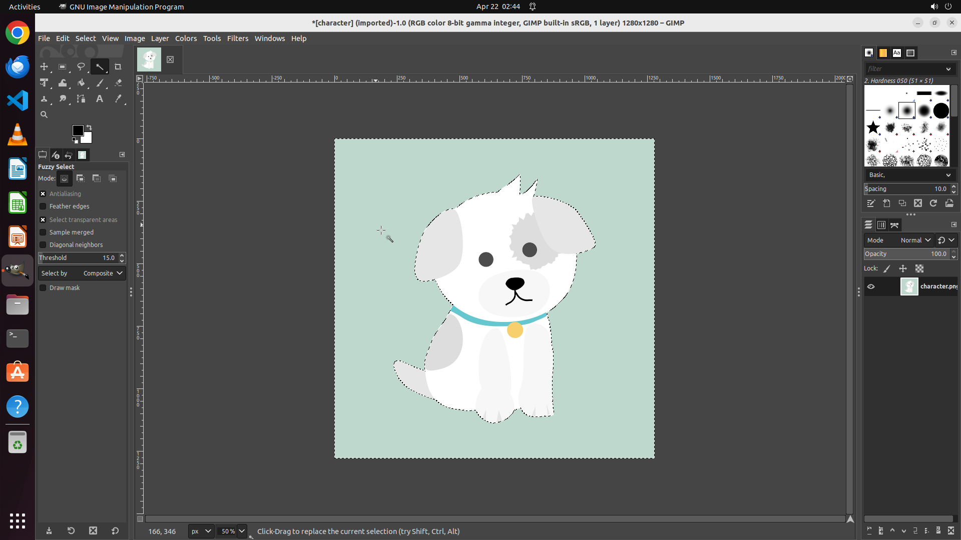 当前状态:GIMP已打开,character.png已加载,显示白色小狗在青色背景上。当前激活的是Rectangle Select Tool,这不是我需要的Fuzzy Select Tool。
