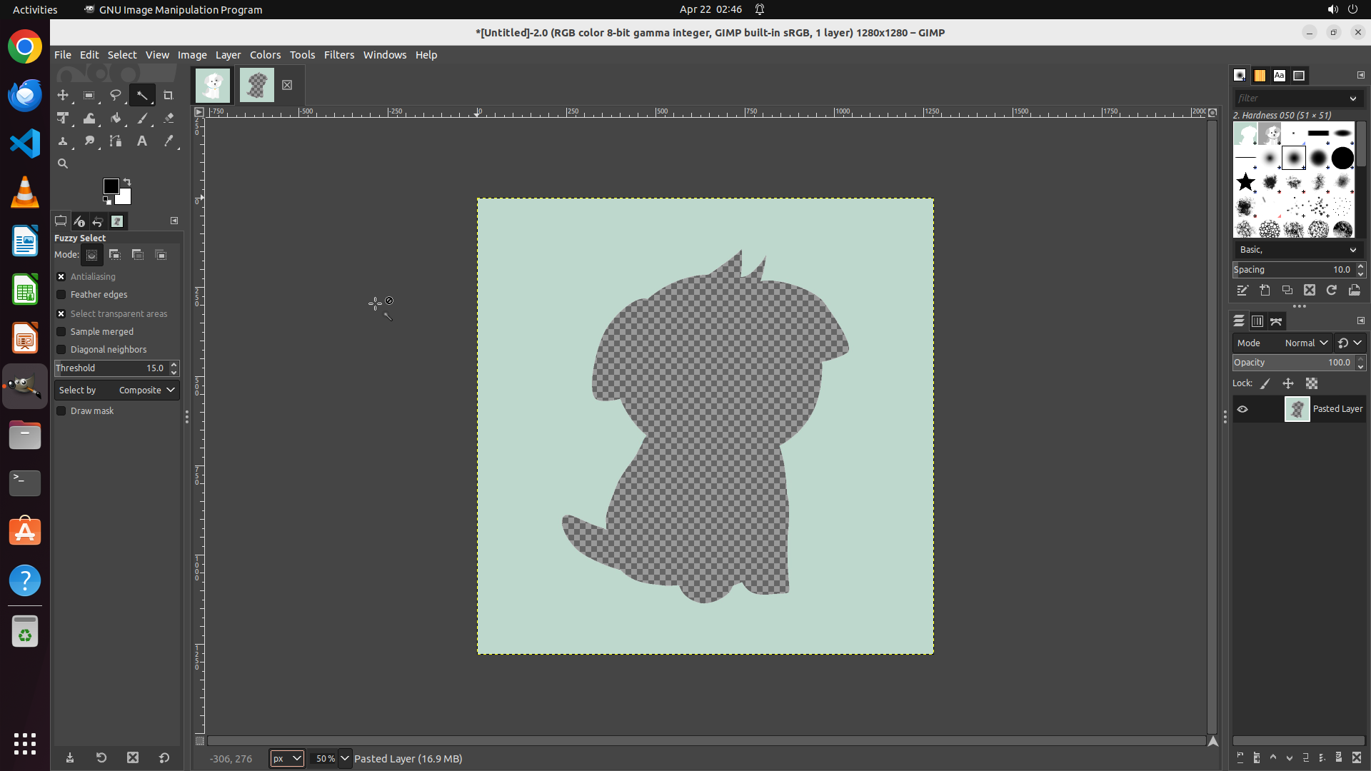 当前状态:GIMP已打开,character.png已加载,Fuzzy Select工具已激活。