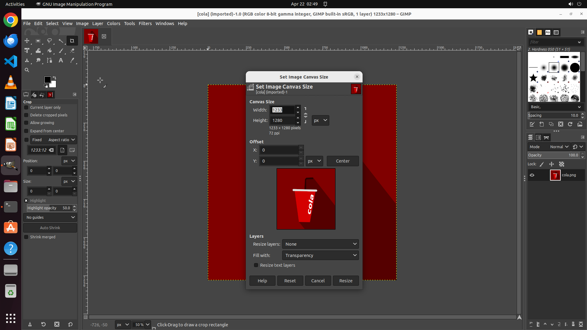 - GIMP应用程序窗口可见,窗口标题栏包含'cola.png'或'GNU Image Manipulation Program'字样