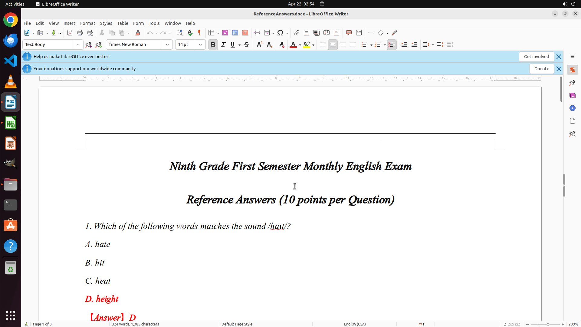 - LibreOffice Writer is currently open with "ReferenceAnswers.docx"