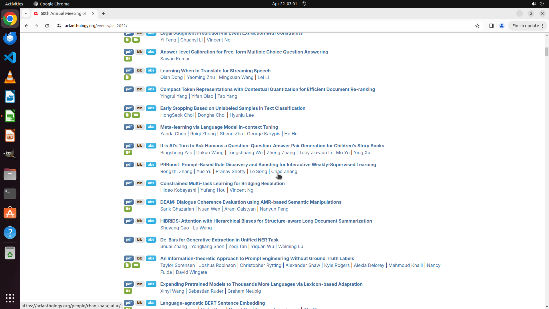 ## 6. 上一次操作的前50步操作简述 ### 步骤 1: - 描述: ``` #### 重要信息 当前 LibreOffice Calc 已打开,文件名为 "best_awards_acl.xlsx"。表格中已有表头(title, year, author list, PDF link)和一行2022年的数据: - 标题:"Learned In..."(部分可见) - 年份:2022 - 作者:"Nikita Kitaev, ..." - PDF链接:https://aclanthology.org/2022.acl-long.220.pd...(部分可见) 还需要查找2019、2020、2021年的最佳长论文奖信息。 #### 情况分析与思考过程 任务需要收集ACL 2019-2022年最佳长论文奖信息。目前已有2022年的一条记录,但还需要: 1. 验证2022年数据的完整性 2. 查找2021、2020、2019年的获奖论文信息 3. 将所有数据按年份降序排列 4. 保存文件 下一步应该打开Chrome浏览器,访问ACL Anthology网站来查找缺失的年份信息。我看到左侧任务栏有Chrome图标,点击它可以打开浏览器。 ``` - 操作: 1. 左键单击坐标 (0.019, 0.058) ### 步骤 2: - 描述: ``` #### 重要信息 Chrome浏览器已成功打开并访问了ACL Anthology网站。当前页面显示了ACL Events表格,其中ACL行包含了各年份的链接。可以看到2022、2021、2020、2019等年份的数字链接(显示为22、21、20、19)。 #### 情况分析与思考过程 任务需要收集2019-2022年ACL最佳长论文奖信息。当前已在ACL Anthology主页,我需要: 1. 点击年份链接进入各年ACL会议页面 2. 查找最佳长论文奖(Best Long Paper Awards)信息 3. 记录标题、作者、PDF链接 4. 之后返回LibreOffice Calc填入数据 我应该按年份顺序逐个访问。先点击"21"(代表2021年)进入ACL 2021会议页面,查找该年的最佳长论文奖信息。从表格中可以看到ACL行下的"21"链接位置。 ``` - 操作: 1. 左键单击坐标 (0.347, 0.281) ### 步骤 3: - 描述: ``` #### 重要信息 当前仍在ACL Anthology主页,上一次的点击似乎没有成功导航到ACL 2021页面。页面显示ACL Events表格,其中ACL行包含各年份的链接(25、24、23、22、21、20、19等)。 #### 情况分析与思考过程 我需要成功点击"21"链接来访问ACL 2021会议页面。观察表格布局,ACL行中的"21"链接位置可能需要更精确的坐标。让我尝试点击"21"链接,它位于ACL行中2026-2020和2019-2010列的交界处附近。 根据表格结构,我应该点击ACL行中的"21"数字链接。让我尝试使用稍微调整后的坐标来点击。 ``` - 操作: 1. 左键单击坐标 (0.347, 0.281) ### 步骤 4: - 描述: ``` #### 重要信息 当前仍在ACL Anthology主页,上一次的点击没有成功导航到ACL 2021页面。页面显示ACL Events表格,其中ACL行包含各年份的链接(25、24、23、22、21、20、19等)。我需要成功点击"21"链接来访问ACL 2021会议页面。 #### 情况分析与思考过程 之前的点击坐标可能没有准确命中"21"链接。让我重新观察ACL行的位置: - ACL行是表格的第二行(AACL下方) - 在ACL行中,年份数字按顺序排列:25 24 23 22 21 20 19... - "21"位于"22"和"20"之间 我需要更精确地点击"21"这个数字链接。从截图来看,ACL行的y坐标大约在0.284左右,而"21"的x坐标应该在0.338左右(在"22"之后、"20"之前)。让我尝试使用更精确的坐标点击"21"链接。 如果这次仍然失败,我可能需要尝试: 1. 使用搜索功能直接搜索"ACL 2021 best paper" 2. 或者尝试在地址栏直接输入URL ``` - 操作: 1. 左键单击坐标 (0.338, 0.284) ### 步骤 5: - 描述: ``` #### 重要信息 当前页面显示的是ACL 2022会议页面(60th Annual Meeting of the Association for Computational Linguistics, Dublin, Ireland, May 22-27, 2022)。页面显示了Links和Volumes部分,但还没有看到最佳论文奖信息。我需要向下滚动查找奖项信息,或者导航到其他年份收集2021、2020、2019年的数据。 #### 情况分析与思考过程 现在我已成功进入ACL 2022页面。虽然表格中已有2022年的数据,但我可以: 1. 先在此页面滚动查找最佳长论文奖信息,验证现有数据 2. 然后导航到2021、2020、2019年收集其余数据 让我先向下滚动查看此页面是否有奖项信息。如果没有,我需要通过地址栏或返回主页来访问其他年份。 考虑到效率,我可以: - 滚动查找当前页面的奖项信息 - 或者直接在地址栏修改URL访问其他年份(如将acl-2022改为acl-2021) 让我先滚动查看当前页面内容。 ``` - 操作: 1. 鼠标滚轮在坐标 (0.5, 0.556) 向下滚动,滚动量 5 ### 步骤 6: - 描述: ``` #### 重要信息 当前页面是ACL 2022会议页面(aclanthology.org/events/acl-2022/),显示的是各种workshop proceedings列表。我可以看到"Proceedings of the 60th Annual Meeting..."等卷册信息,但还没有看到最佳论文奖(Best Papers/Awards)部分。 #### 情况分析与思考过程 我需要继续向下滚动页面来查找ACL 2022的最佳长论文奖信息。通常ACL会议页面会有一个专门的"Best Papers"或"Awards"部分,列出当年获奖的论文。让我继续滚动查找这个部分。 找到2022年的奖项信息后,我还需要: 1. 导航到ACL 2021页面收集数据 2. 导航到ACL 2020页面收集数据 3. 导航到ACL 2019页面收集数据 4. 返回LibreOffice Calc填写所有数据并保存 让我继续向下滚动查找奖项信息。 ``` - 操作: 1. 鼠标滚轮在坐标 (0.5, 0.556) 向下滚动,滚动量 5 ### 步骤 7: - 描述: ``` #### 重要信息 当前页面显示的是ACL 2022会议页面,展示了Volume 1: Long Papers的论文列表。我看到了多篇论文的标题和作者信息,但还没有看到最佳论文奖(Best Papers/Awards)部分。 #### 情况分析与思考过程 我需要继续向下滚动页面来查找ACL 2022的最佳长论文奖信息。通常ACL会议页面会有一个专门的"Best Papers"或"Awards"部分,列出当年获奖的论文。让我继续滚动查找这个部分。 找到2022年的奖项信息后,我还