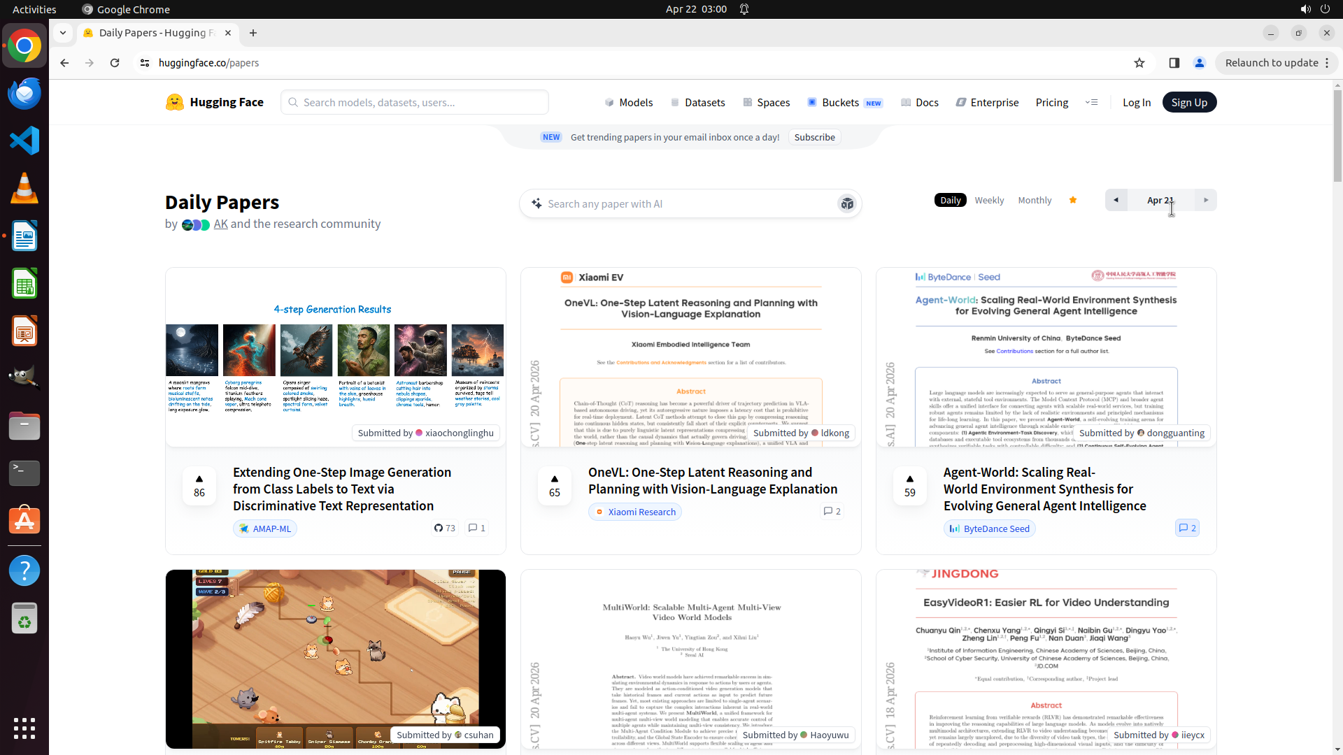 Chrome浏览器已成功打开并访问了huggingface.co/papers页面。当前页面显示的是"Daily Papers",但日期显示为"Apr 21"(4月21日)。页面顶部有日期选择器,显示"Daily"、"Weekly"、"Monthly"选项,以及当前的"Apr 21"日期。页面展示了多篇论文卡片,包括关于EMF、OneVL、Agent-World等论文。